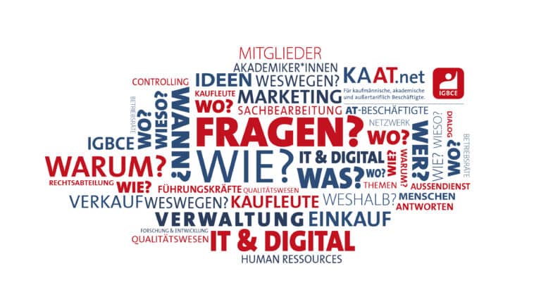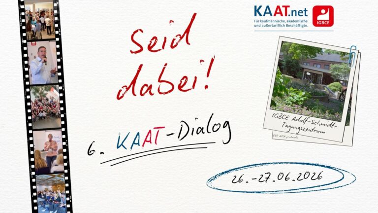 KAAT.net ist das besondere Angebot der IGBCE für Kaufleute, Akademiker*innen und AT-Beschäftigte. Bei uns findet ihr Beiträge, Veranstaltungshinweise und den KAAT-Newsletter, die alle auf eure Themen zugeschnitten sind. Und damit ihr uns eure aktuellen Anliegen, Fragen und Themen mitgeben könnt, gibt es auch einen „direkten Draht“ zu uns: Einfach per Mail an kontakt@kaat.net bzw. über das Kontaktformular.